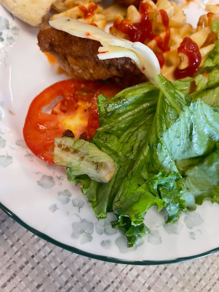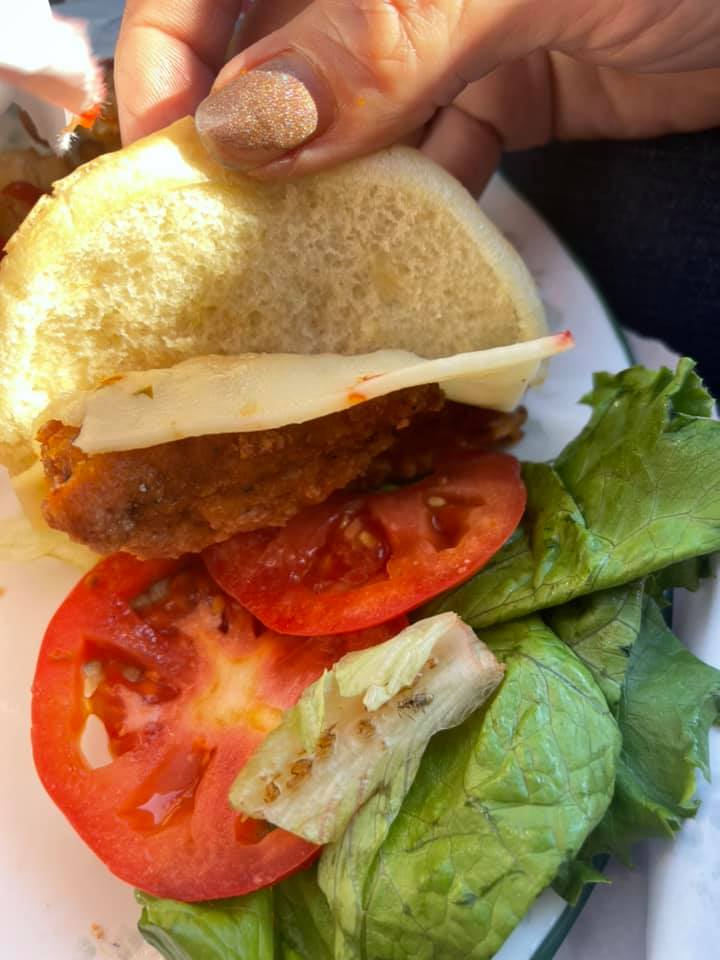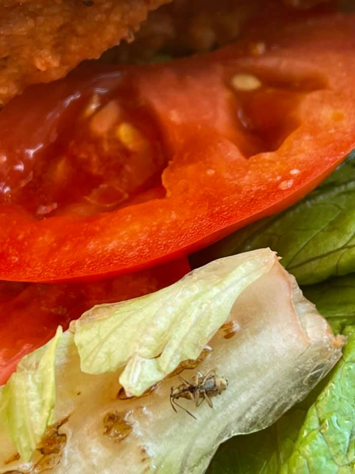 The customer went to the Chick-fil-a and ordered a delicious fried chicken sandwich with tomatoes, cheese, and lettuce. The customer was about to bite into his scrumptious hot sandwich, but he noticed rotten lettuce and a bug in his sandwich.