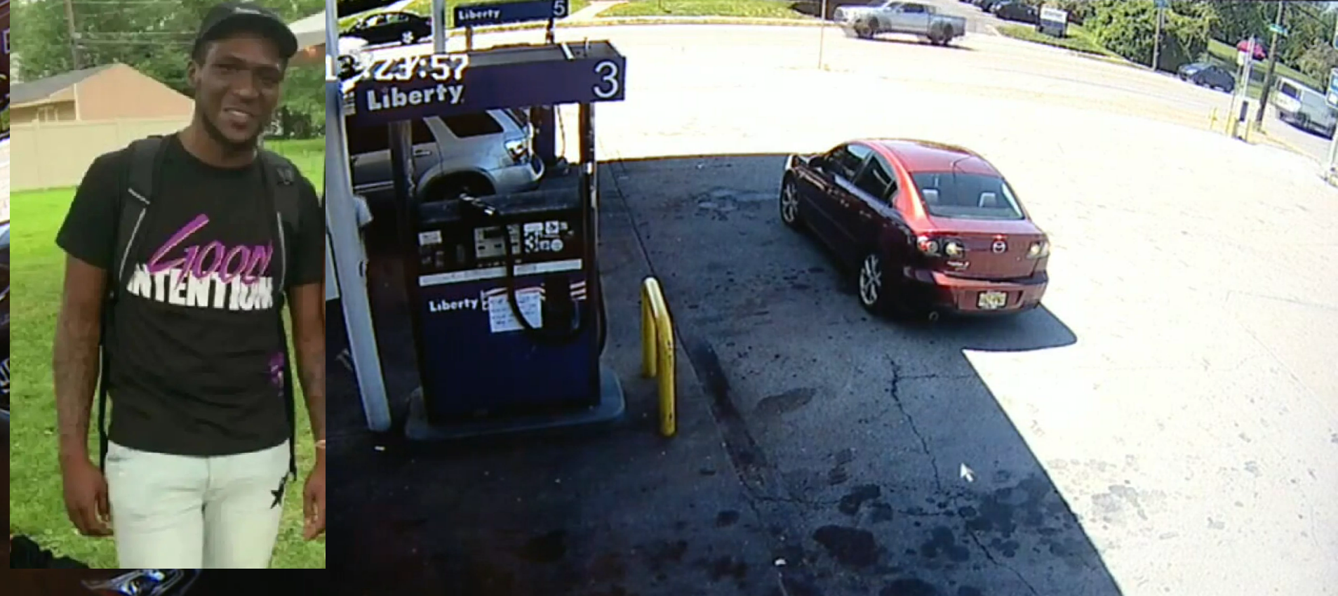 The homicide was at 2:30 pm. Two suspects wearing black clothing approached Brandon who was pumping gas.